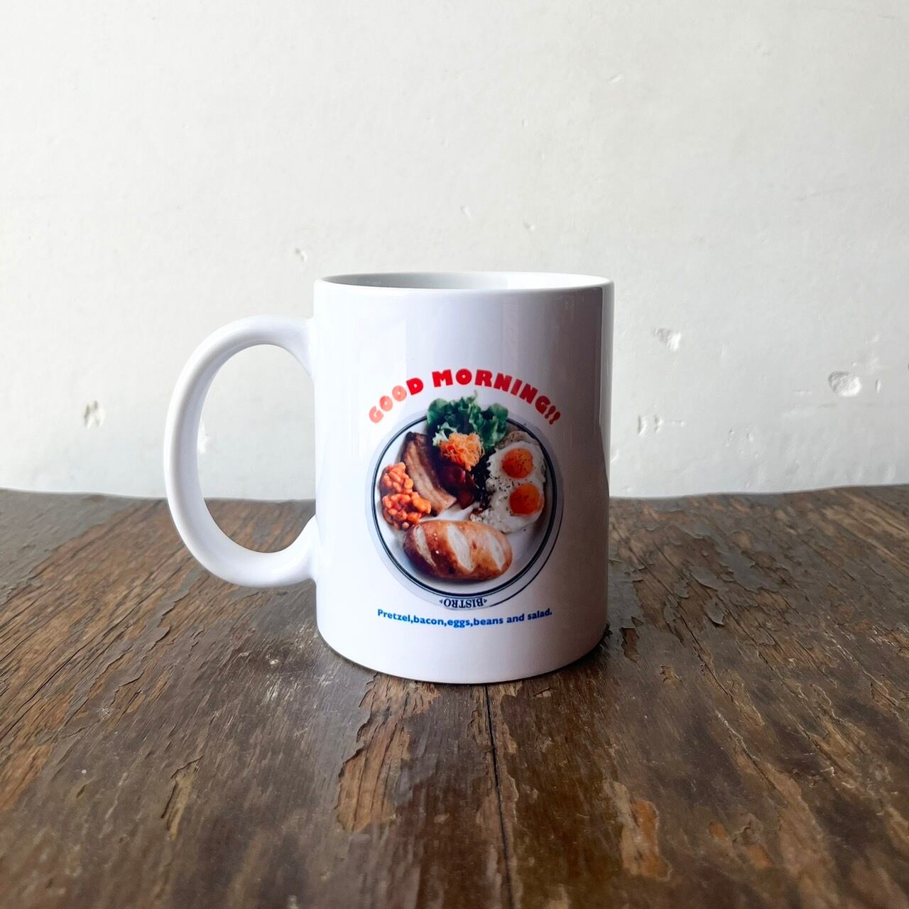 自家製のプレッツェルを使った朝ごはんの写真とイエローのロゴ入りです。