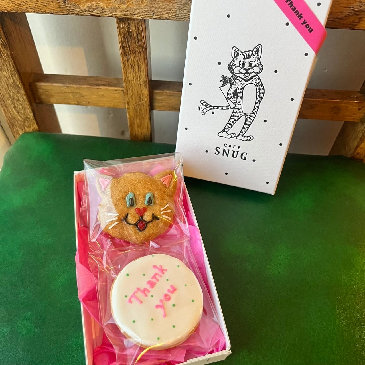 北海道産全粒粉をたっぷり使った、猫のお顔のクッキーとThank youのアイシングクッキーが1枚ずつ入っています。