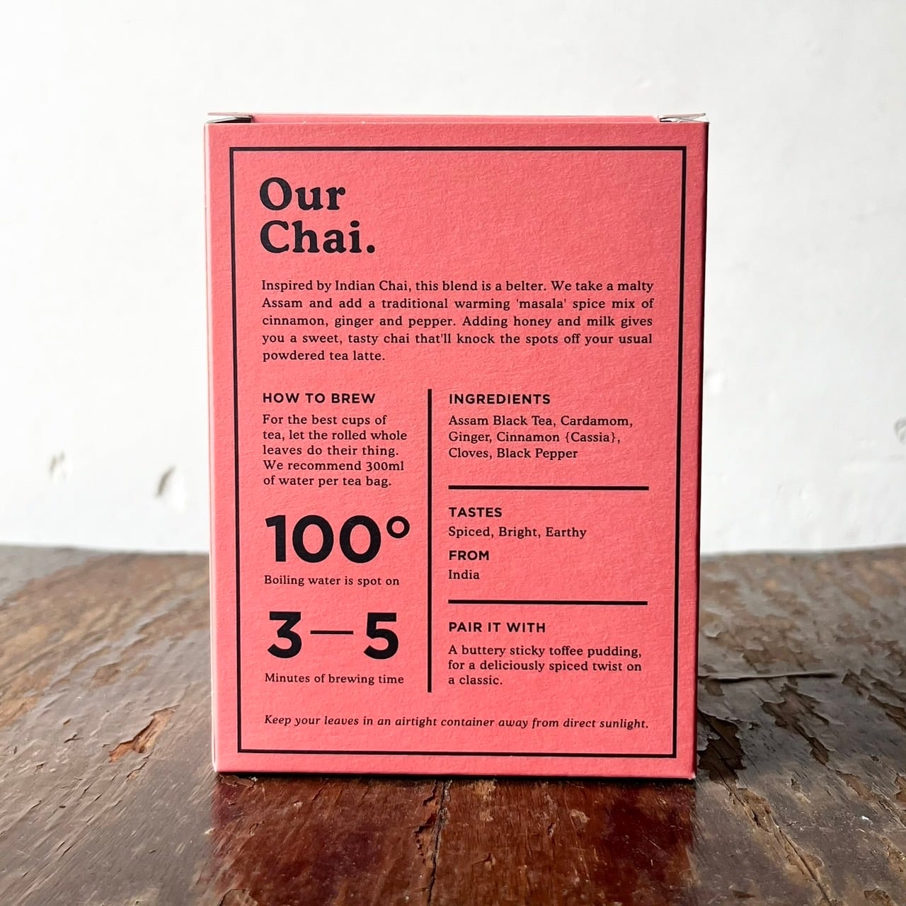 カルダモン、ジンジャー、シナモン、クローブ、ブラックペッパーと上質なアッサムティーのホールリーフをブレンドしたチャイ。